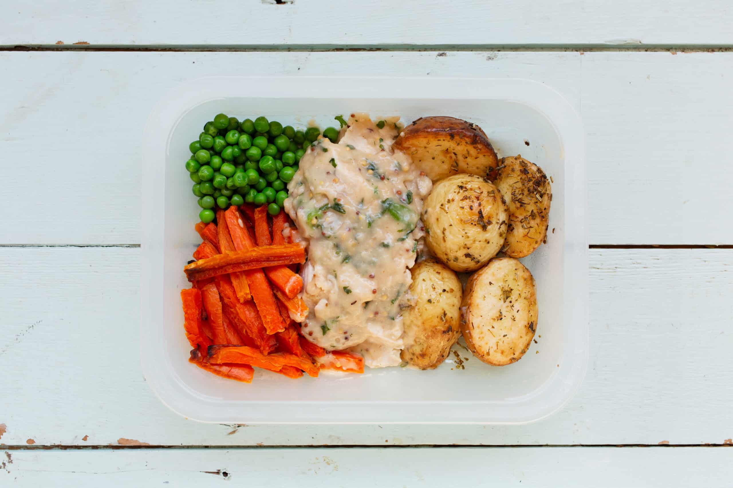 A classic dish that needs little introduction. Slices of juicy chicken breast are topped with honey mustard sauce, and served with a side of roast potatoes, peas and roast carrots.