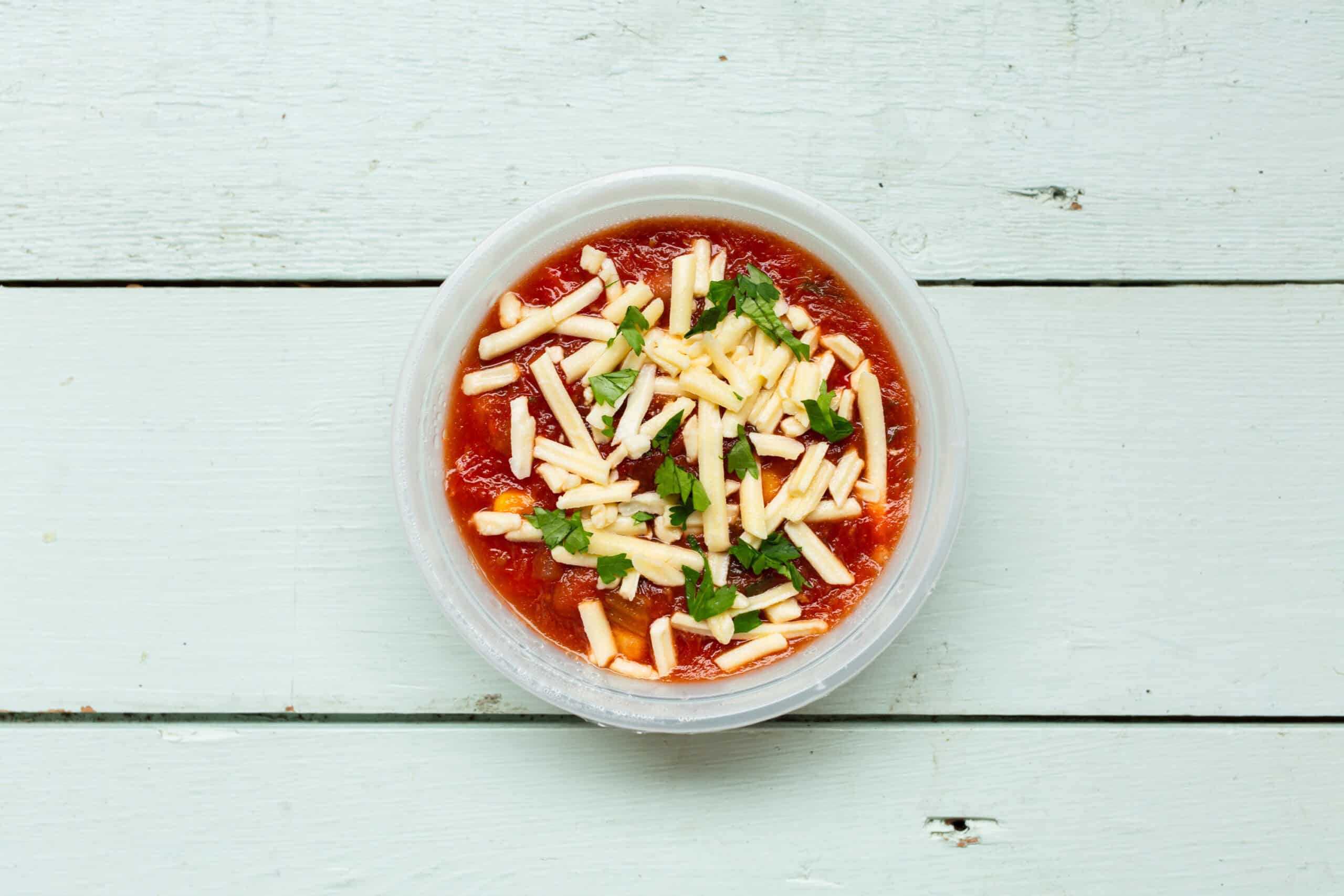 If you’ve been enjoying our range of Mexican meals, this fresh and flavorful soup is for you! Vegetables and beans are cooked in lighlty-spiced tomato soup, and topped with cheese.